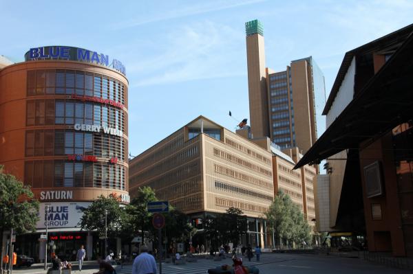 Спустились вниз, полюбовались на Потсдамер-платц, который застроен в духе какого-нибудь Дубая - сплошное стекло и бетон. Правда, Берлин - город бедный (это вам не зажравшийся Гамбург), поэтому несколько зданий в левой части площади - чистые Потемкинские деревни. Нет там реальных зданий, только картинки на фасаде - вот, например, дом за плакатом Samsung. Это все нарисовано. А сразу и не скажешь.