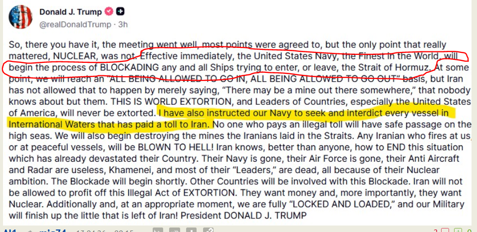Итак, вот и все: встреча прошла успешно, по большинству вопросов было достигнуто согласие, но по единственному действительно важному вопросу — ЯДЕРНОМУ — согласия достигнуто не было. С этого момента Военно-морские силы США, лучшие в мире, начнут БЛОКИРОВАТЬ все без исключения суда, пытающиеся войти в Ормузский пролив или выйти из него. В какой-то момент мы достигнем принципа «ВСЕМ РАЗРЕШЕНО ВХОДИТЬ, ВСЕМ РАЗРЕШЕНО ВЫХОДИТЬ», но Иран не позволил этому случиться, просто заявив: «Там где-то может быть мина», о которой никто не знает, кроме них. ЭТО МИРОВОЕ ВЫМОГАТЕЛЬСТВО, и лидеры стран, особенно Соединенных Штатов Америки, никогда не поддадутся вымогательству. Я также отдал приказ нашему флоту выявлять и задерживать в международных водах каждое судно, которое заплатило Ирану пошлину. Никто, кто платит незаконную пошлину, не получит безопасного прохода в открытом море. Мы также начнем уничтожать мины, заложенные иранцами в проливе. Любой иранец, открывающий огонь по нам или по мирным судам, будет ВЗОРВАН В ЧЕРТОВСКИЙ ОГОНЬ! Иран знает лучше всех, как ПОЛОЖИТЬ КОНЕЦ этой ситуации, которая уже опустошила их страну. Их ВМС уничтожены, их ВВС уничтожены, их зенитные системы и радары бесполезны, Хомейни и большинство их «лидеров» мертвы — и все это из-за их ядерных амбиций. Блокада начнется в ближайшее время. Другие страны присоединятся к этой блокаде. Ирану не позволят извлечь выгоду из этого незаконного акта ВЫМОГАТЕЛЬСТВА. Они хотят денег и, что еще важнее, они хотят ядерного оружия. Кроме того, в подходящий момент мы будем полностью «ГОТОВЫ К БОЮ», и наши вооруженные силы уничтожат то немногое, что осталось от Ирана! Президент ДОНАЛЬД ДЖ. ТРАМП