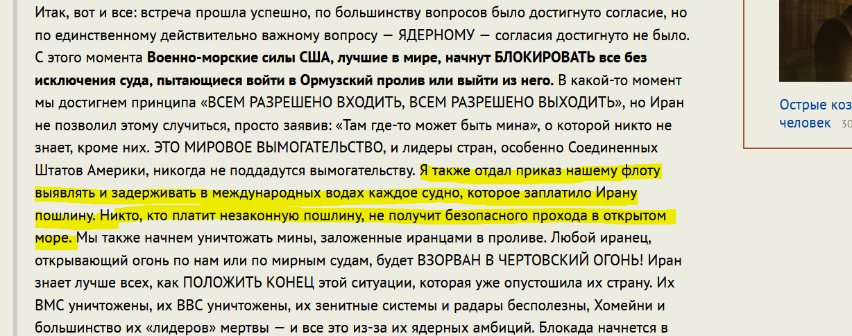 В целом решение Трампа блокировать пролив – правильное, так как других эффективных способов давления на Иран нет.