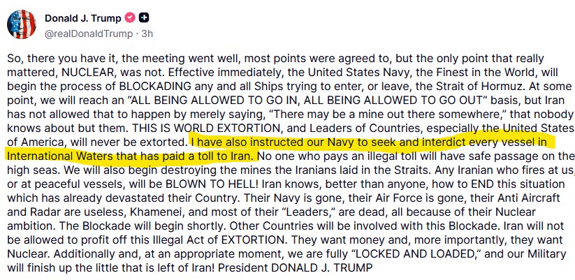 В своем первом посте в Truth Social, в котором он объявил о блокаде, Трамп написал, что ВМС США получили приказ останавливать суда, уплачивающие Ирану то, что он охарактеризовал как незаконные сборы.