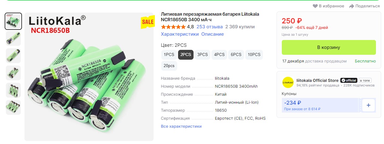 Выгоднее брать наборами, так цена за штуку будет ещё ниже! Батареи имеют типоразмер 18650, ёмкость 3400 мАч и напряжение 3,6 В.