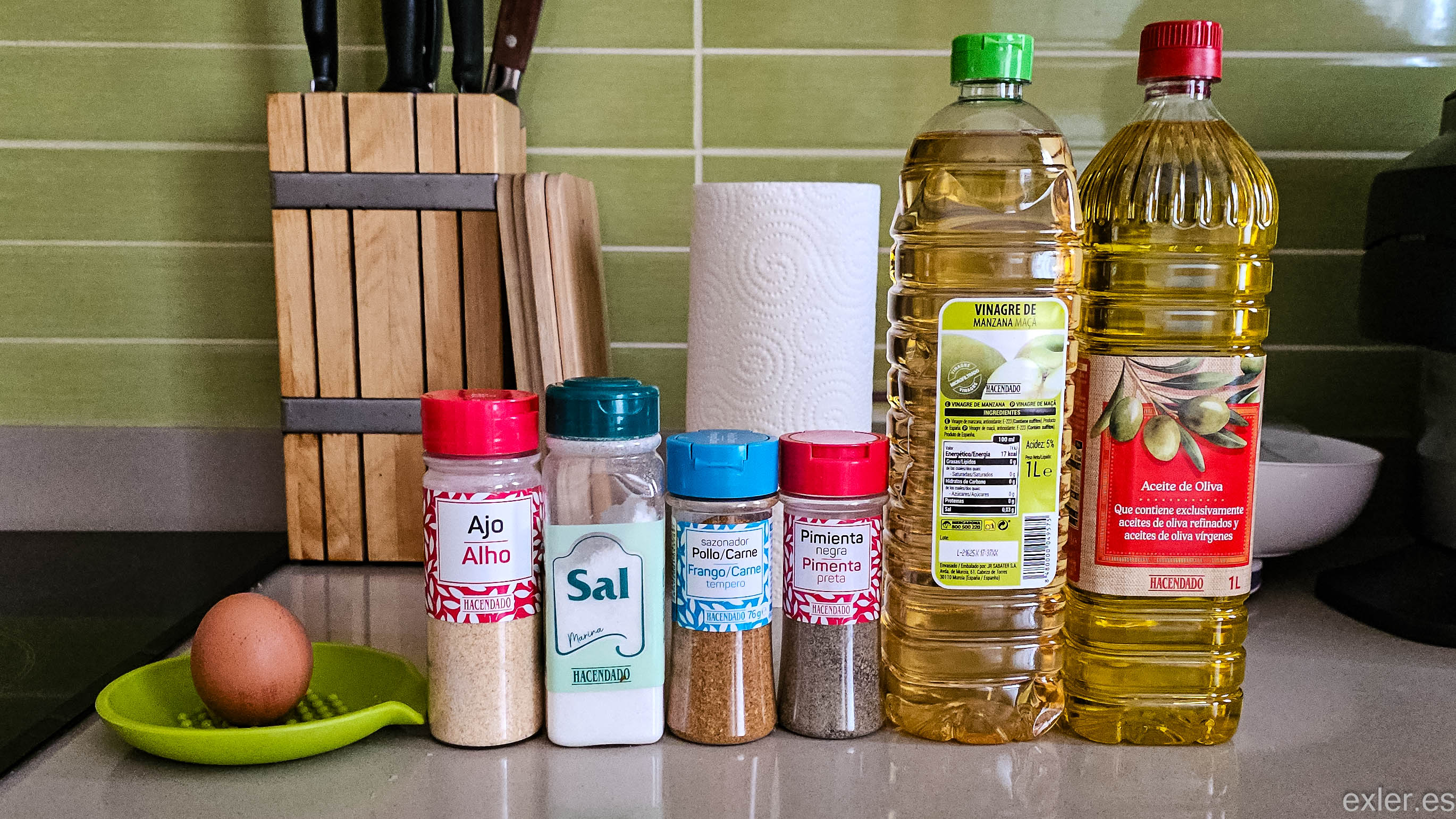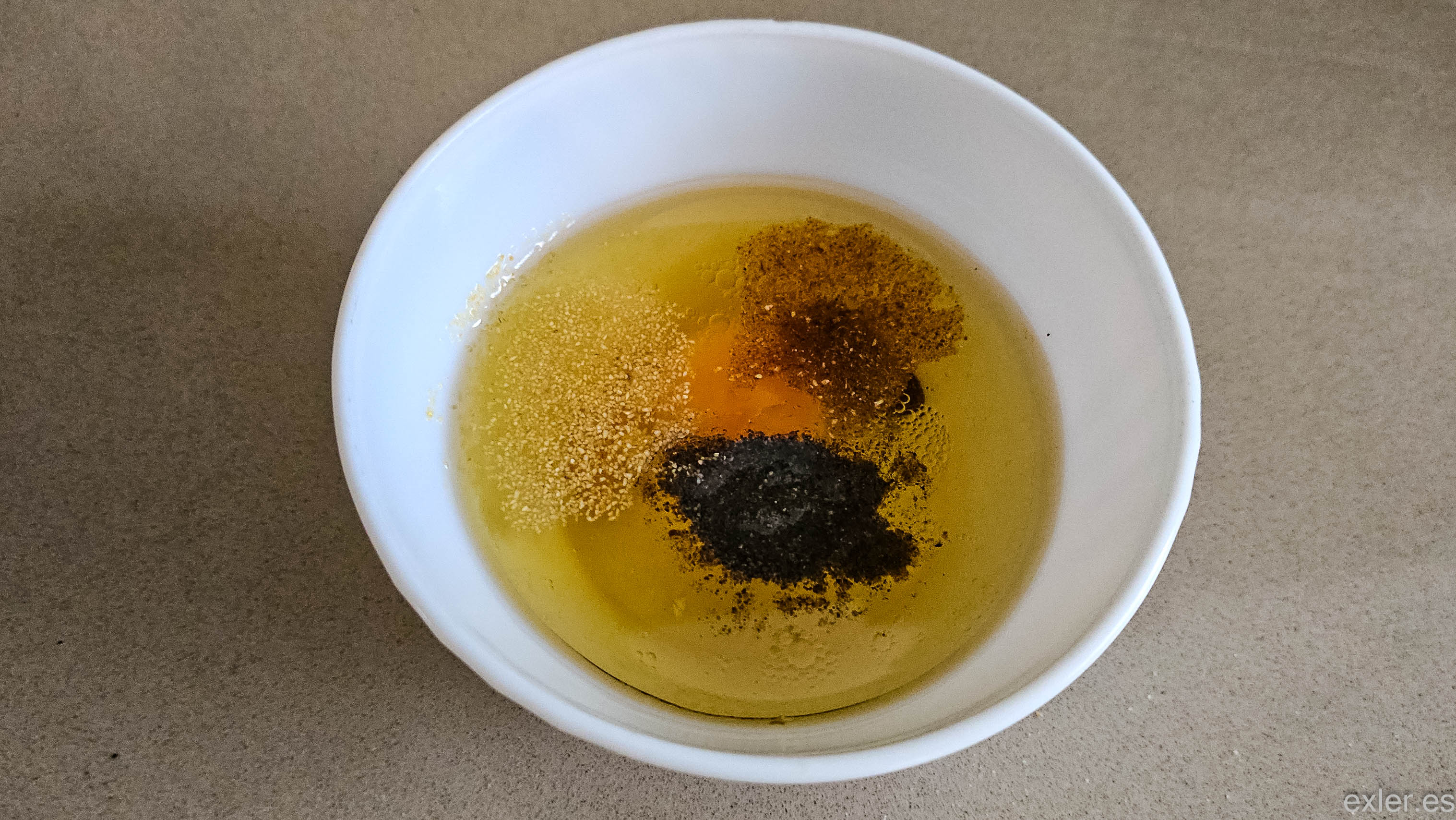 Нам понадобится: яблочный уксус, оливковое масло, сырое яйцо, соль, черный перец, сухой чеснок, также можно добавить немного специй для курицы.