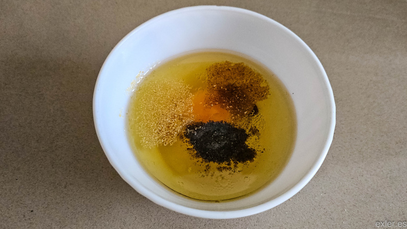 Все это нужно как следует перемешать: в оригинальном рецепте советуют воспользоваться блендером, но я взбиваю вилкой или венчиком, и считаю, что с блендером можно не морочиться.