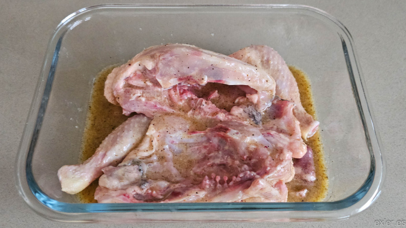Но мне не нравится возиться с пакетом, я кладу курицу в стеклянную емкость, как следует поливаю половинки курицы с двух сторон, потом переворачиваю половинки вниз - так вся верхняя часть будет находиться в маринаде, что и требуется, - накрываю крышкой и ставлю в холодильник.