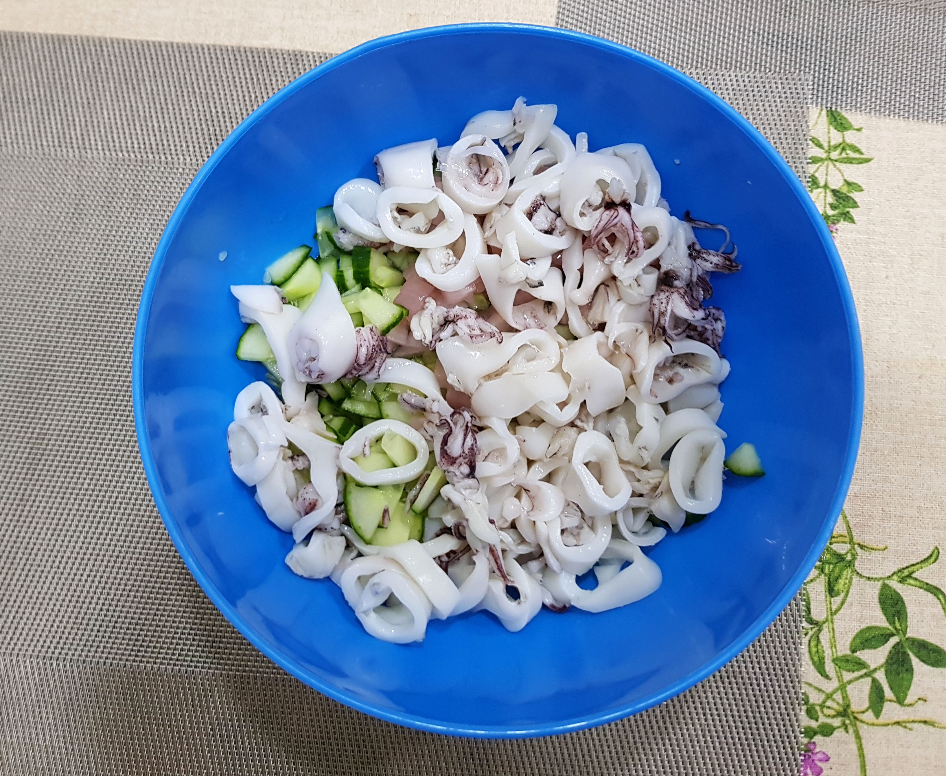 И тут очень удобно то, что порция майонеза делается на 5-6 салатов, лук маринуется на 5-6 салатов, кальмары прямо из морозилки варятся минут 6, огурец покрошить - пара минут во время варки кальмаров.