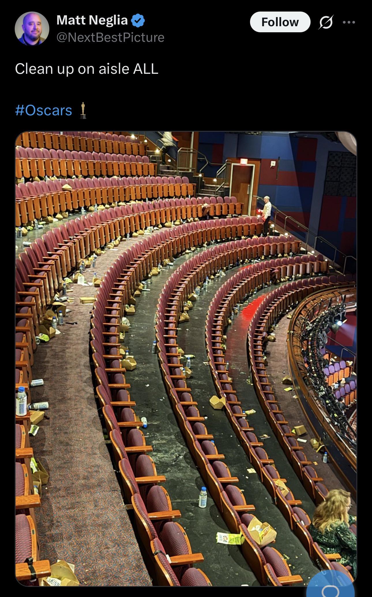 Они смотрят церемонию и параллельно на коленях едят фастфуд прямо в костюмах и вечерних платьях? У них же потом приемы после церемонии.
