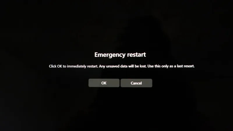 Это действие приводит к появлению на экране сообщения о попытке аварийной перезагрузки и добавлению: «Нажмите «ОК» для немедленной перезагрузки. Все несохранённые данные будут потеряны». В конце сообщения говорится: «Используйте это только в крайнем случае». Нажмите «ОК», и ваш компьютер выключится и включится в обычном режиме.