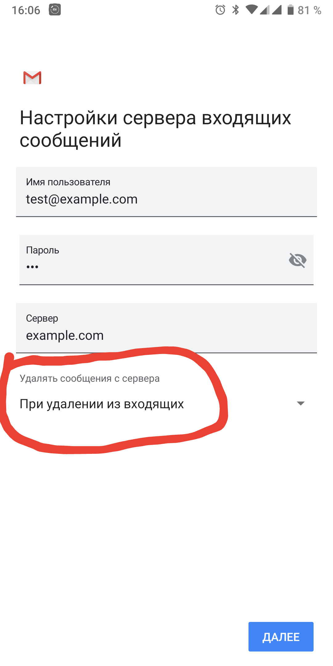 С настройкой как на скрине, почта при удалении из входящих в Gmail android - удалилась полностью с сервера. После изменения настройки на: "Не проверять" - письмо осталось на сервере во входящих даже после удаления из корзины Gmail android.