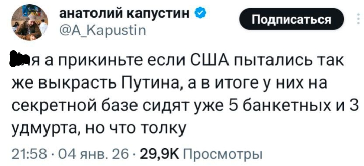 Я вообще удивляюсь, как даже вменяемые и неглупые люди (нетрамписты) на полном серьезе радуются произошедшему в Венесуэле и думают, что это, типа, ради демократии (йеа райт), или из-за наркотиков (йеа рат), или что путин - следующий (eye roll).