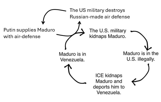 Кого это вобще волнует, какая-то Венесуэла - 80% населения за чертой бедности в стране с самыми большими запасами нефти. Диктатор - наркобарон, уничтожает оппонентов, и регулярно подтасовывает выборы. Правительство ведет антиамериканскую политику много лет, еще при Обаме Венесуэла признана враждебной для интересов США. Байден назначил 25 миллионов приз за этого Мадуро, но арестовать не решался. И тут злобный враг человечества Трамп посмел, в обход международных законов, нарушить суверенитет прекрасного государства Венесуэла, и похитить лучшего друга Ирана, Хезболлы, России и Китая. Все они сильно возмущены, а вместе с ними и псевдо-гуманисты, защитники демократии, и сам генсек "шарашки под названием ООН".