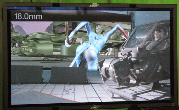 После показа того, как виртуальная камера снимает реальных актеров и помещает их в мир Пандоры, нам показали обратный процесс: как виртуальные персонажи (уже сделанные с реальных актеров) снимаются вместе с реальными актерами.