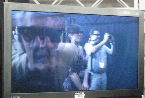 Причем еще и продемонстрировали как это все работает: нам раздали очки, камеру включили - и на экране здоровенной панели были мы в трехмерном изображении. Выглядело это очень эффектно. Фотография, конечно, трехмерность не передаст, но физиономия Ивана Кудрявцева на переднем плане в очках просто-таки вылезала из телевизора.