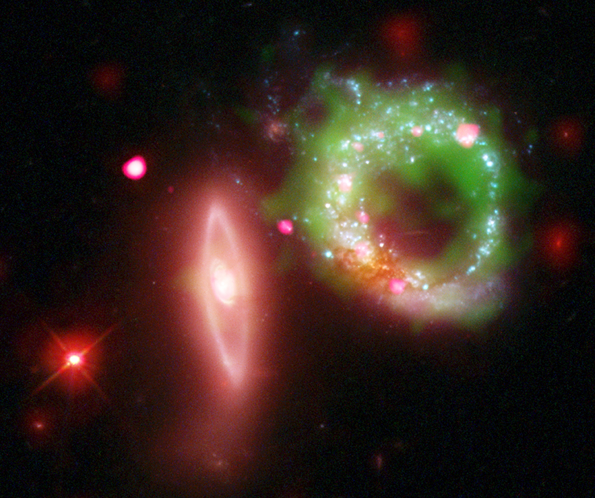 Вот моя любимая фотография, прозванная космической валентинкой. Это объект Arp 147 (№147 из каталога Арпа). Это две галактики. Левая, эллиптическая, пролетела сквозь правую спиральную, проделав в ней дырку от бублика. Ударная волна вызвала вспышку звездообразования в бублике, из-за чего появилось много массивных звезд класса О, которые вспыхнули как сверхновые и образовали много черных дыр. ЧД отмечены на фото малиновым.