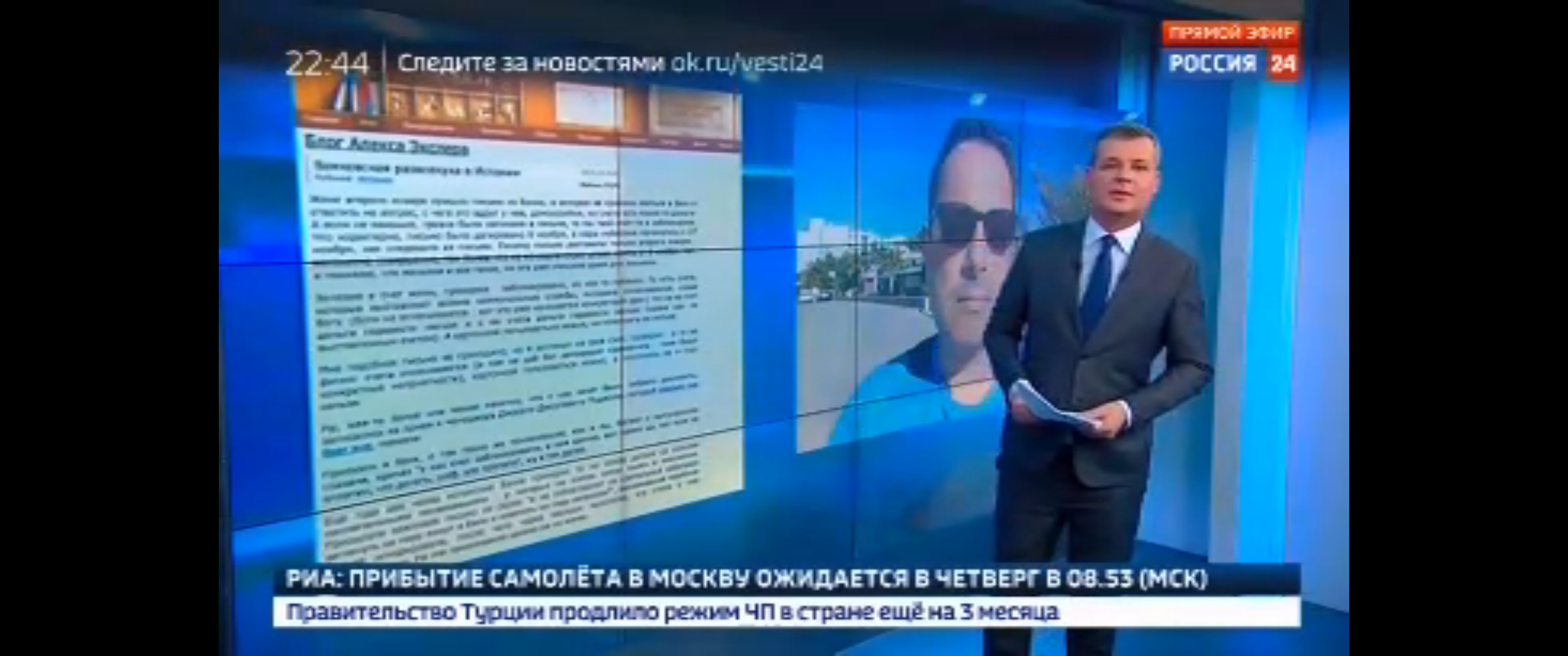 Теперь моя довольная рожа на прогулке появилась на большинстве телеэкранов России в передаче "Россия 24" - в сегодняшнем выпуске в 22:30. Там цитировали мою запись про блокировку счетов (то-то сегодня из стольких СМИ звонили). Кстати, процитировали точно, ничего не переиначили и не исказили - за это спасибо.