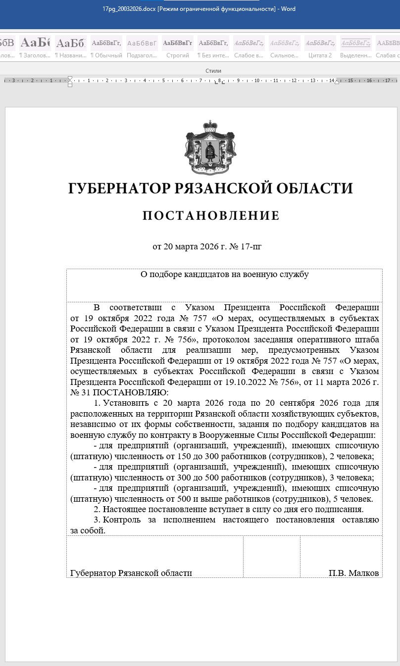 В Рязанской области бизнес обязали предоставлять кандидатов на военную службу по контракту