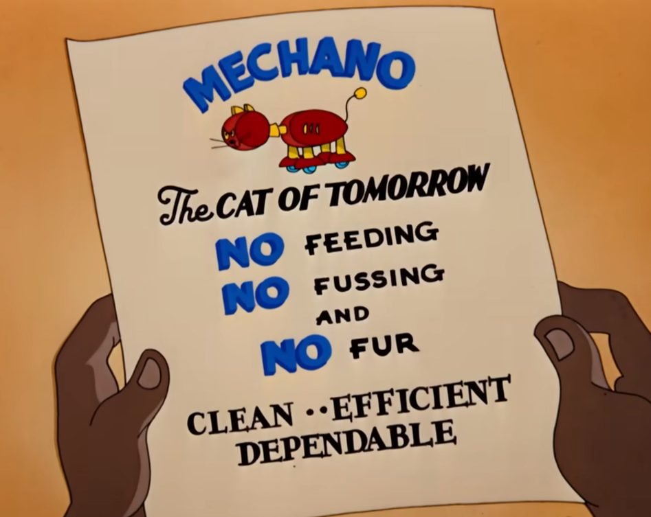 Более жизнеутверждающий мультик. Про AI-робокота. "All I want is a plain old-fashioned cat".