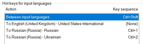 Я писал о том, как я использую три клавиатурных раскладки - русскую, испанскую и английскую: у меня установлены русская и английская раскладки, а для английской заведена еще вторая испанская раскладка, которая переключается отдельным сочетанием клавиш. То есть русская-английская - стандартное сочетание, а английская-испанская - специальным сочетанием с английской (подробности тут).