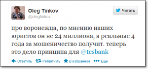 Другие подробности не раскрываются. В TCS Group также подчеркнули, что Тиньков уверен в урегулировании дела в кратчайшие сроки. (Отсюда.)