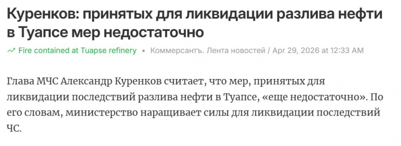 "Вот последний пример - это удары по энергетическим объектам в Туапсе, которые потенциально могут вызвать и экологические последствия серьезные, - указал Путин. - Правда, вот губернатор только что докладывал, он на месте находится, во всяком случае, пару часов назад находился, серьезных угроз нет там, и люди справляются на месте с теми вызовами, с которыми сталкиваются". (Отсюда.)