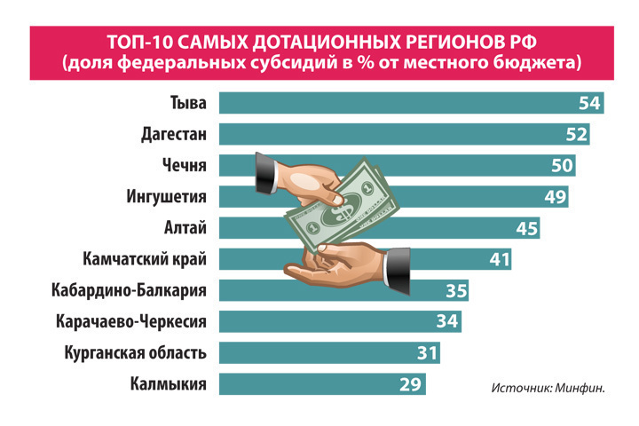 2. Дагестан, действительно, один из самых дотируемых регионов. Но он не сильно опережает Чечню. Данные из разных источников разнятся, и там встречаются фантазии, но вот у РБК надежные, хоть и довольно старые данные есть.