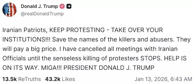 А говноед трамп перед особо мощным taco пообещал протестующим поддержку. Ну и похоже должна была быть операция совместно с Израилем - из израильских ТГ-каналов читал, что все стояли на низком старте.