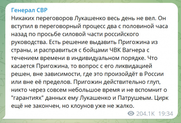 Пресс-служба Пюрера внезапно сообщила, что Лукашенко, дескать, достиг договоренности с Пригожиным, так что теперь "Пригожин принял предложение президента Белоруссии об остановке движения ЧВК и дальнейших шагах по деэскалации напряжения".