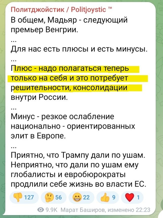 Не, ну то, что Орбан уже сам признал и поздравил Мадяра с победой - это внушает оптимизм.