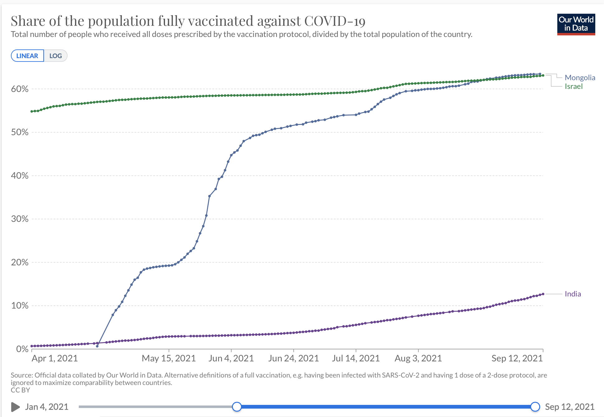 К 17 августа в Монголии было полностью вакцинировано от коронавируса 97,8% взрослого населения, свыше двух миллионов человек. А в начале сентября Монголия - еще и при ее малой плотности населения - вышла на первое место в мире по текущей заболеваемости, побив свой же собственный предыдущий абсолютный рекорд по числу ежедневных заражений, и обогнала даже Израиль.