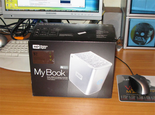 Но просто дешевую внешнюю коробку для трехдюймового винта покупать не хотелось - там и охлаждение не фонтан, и сервисов никаких нет. Вспомнил обсуждение в комментариях к одной из записей в этом блоге, порылся в Сети и в результате заказал вот такую штуку - WD My Book Pro Edition II. Это внешняя бандура, в которой установлены два 500-гиговых винта. Вы можете использовать весь терабайт, а можете для надежности использовать винты в RAID 1 - то есть зеркалить 500 гигов. Она поддерживает три интерфейса: USB 2.0, Firewire 1394a и 1394b.