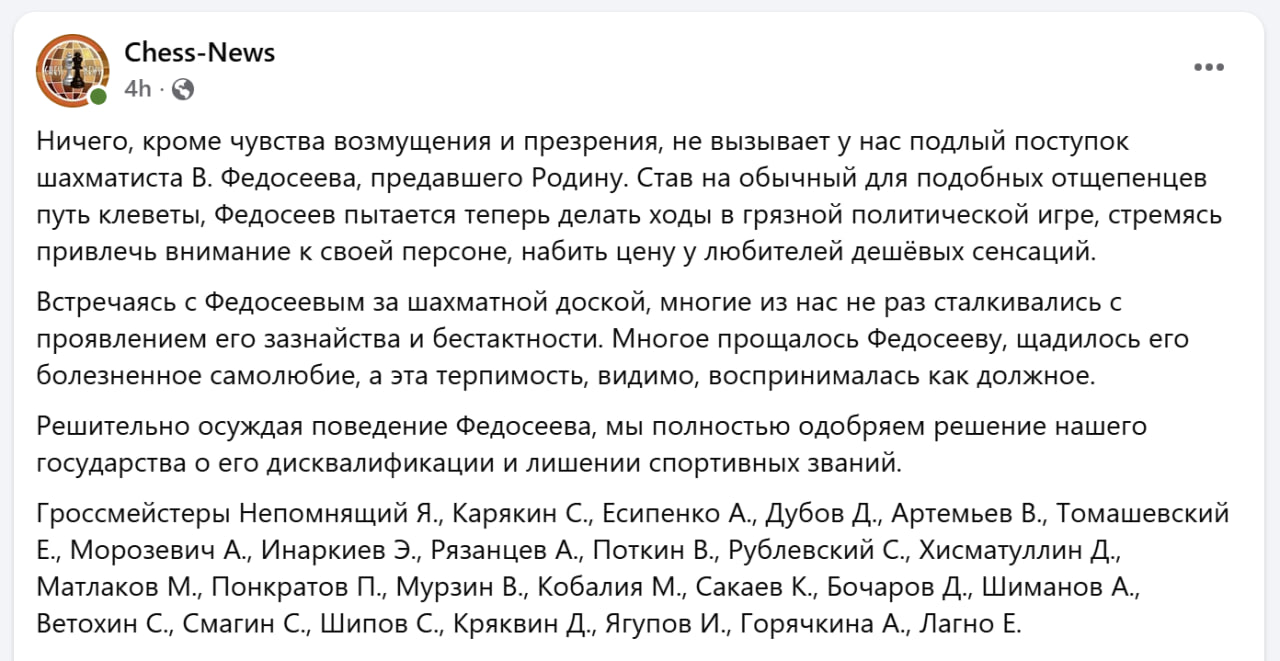 Разделяя возмущение российской общественности недостойным поведением Федосеева, я поддерживаю решение Министерства спорта РФ о лишении его спортивных званий и права представлять на мировой арене российскую шахматную школу.