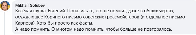 Еще коммент:Sergey FadeyevСлишком тонко))) Надо было хотя бы * поставить и пояснение дать. Не ожидал, что 95% не знает классику.______________________________________________________________Как по мне, важно то, что мало кто усомнился в реальности письма. А Карпов прилетел добавить от себя, отдельно.Solmir