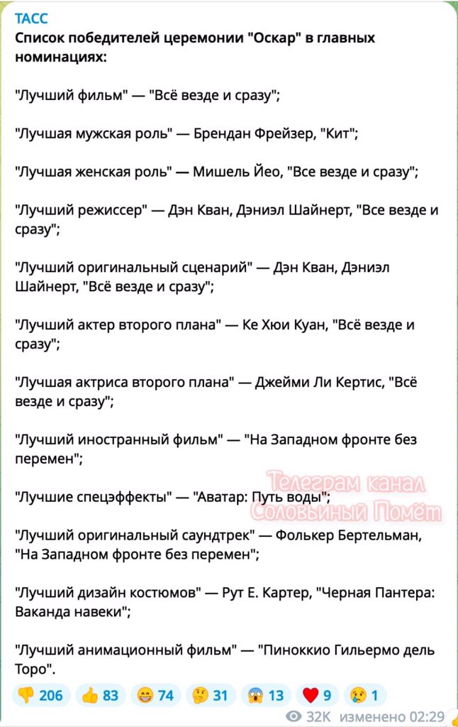 Очень рад за "Всё, везде и сразу", дуэт Дэниелов - мегаталантищи. Тот редкий случай, когда новаторское революционное кино оценили выше, чем академическое, созданное по классическим лекалам. "Фабельманы" - кино само по себе хорошее, но академка-академкой.