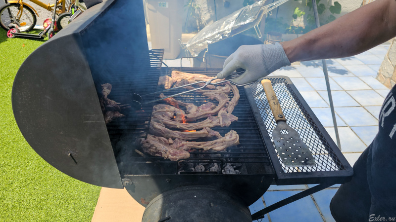 Серхио для этого использовал дровяную печку под казан, большую решетку для жарки и подпорку. Говяжьи ребра - блюдо очень непростое, его нужно готовить довольно долго при определенных условиях. Мясо сверху было накрыто фольгой.