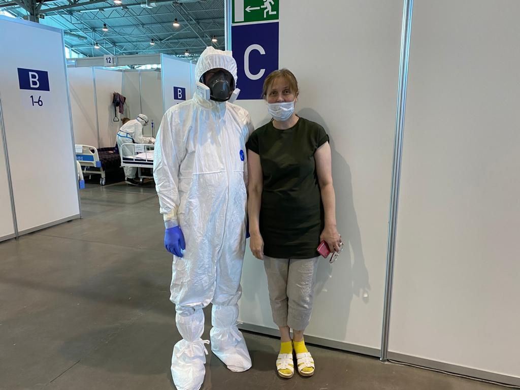 видно медработника на заднем плане в таком же костюме
