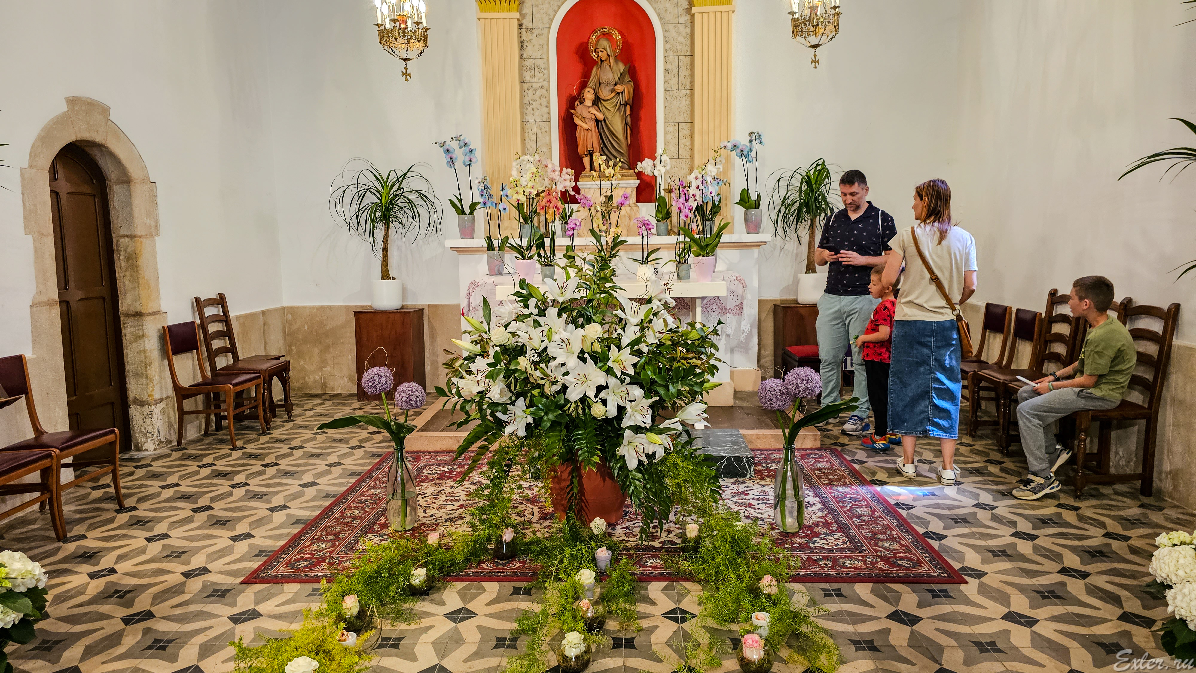 Инсталляция в часовне. Вообще-то предполагается, что люди зайдут в часовню, полюбуются со стороны на инсталляцию и выйдут, но вот это семейство приперлось в саму инсталляцию и стало там тусоваться, тупить в телефончики, трогать цветы и так далее. А все остальные, вместо того чтобы любоваться на инсталляцию, должны были смотреть, как это сборище недоумков там уродуется. Причем они там засели надолго, я так и не дождался, чтобы они оттуда свалили - просто надоело ждать. Люди бывают поразительными идиотами, с этим трудно спорить.