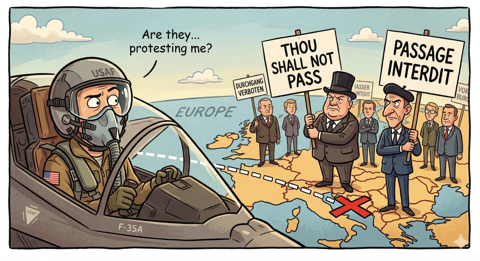Отношение Европы к войне, которая есть "война за нашу и вашу свободу", ужасно и подло. Понятно, что Европе нечем в войне участвовать, и Трамп ее оскорбил. Но запрещать американцам садиться на амер. базах для дозаправки и пролетать над своей территорией (Испания, Франция, Италия, Германия) - что не стоит Европе вообще ничего, это подлость и подножка Америке, за которую Европа конечно ответит.