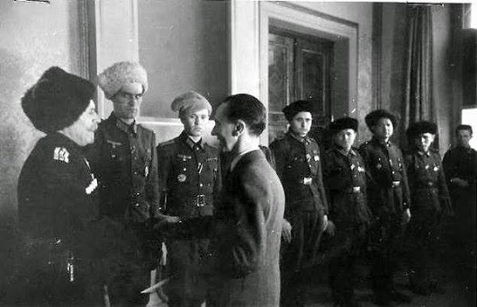 На фото "Рейхсминистр Геббельс награждает донских казаков за доблестную службу в СС. 1944 год"