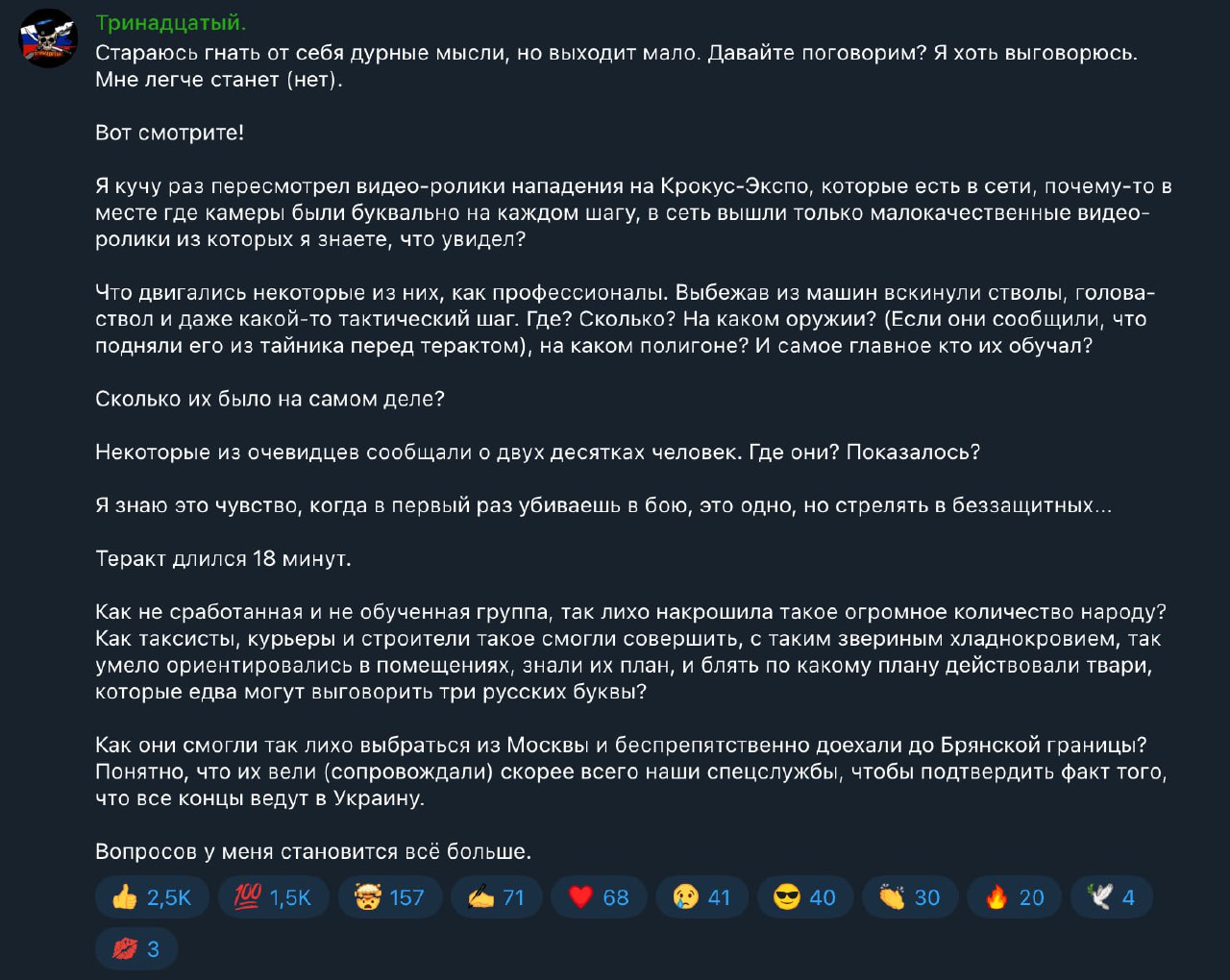 К весне 2024-го главные по версии Путина экстремисты были уничтожены, вырваны с корнем. Их "главарь" убит в тюрьме. Через 22 дня после его похорон вооруженные до зубов отморозки нападают на одну из самых престижных концертных площадок Москвы, убивают там более сотни людей, после чего скрываются с места преступления. Что это, как не грандиозный провал путинской опричнины, которая все эти годы терроризировала законопослушных сторонников Навального вместо того, чтобы бороться с реальными экстремистами? Хочется плюнуть в рожу каждому из 140 следаков, которые натягивали сову на глобус, фабрикуя уголовные дела лучшим гражданам страны вместо того, чтобы заниматься реальными преступниками. Жертвы вчерашнего теракта на совести всех, кто по заказу диктатора уничтожал оппозицию вместо того, чтобы бороться с настоящим злом. Избивать безоружных демонстрантов и отправлять на зону девочек за антивоенные стихи — это все, на что вы, ничтожества, способны. "Силовики" — позор России."
