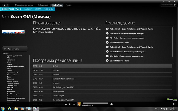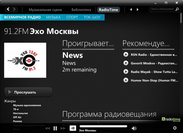 Там же можно выбирать радиостанции, знакомиться с их расписанием и прослушивать в онлайне.