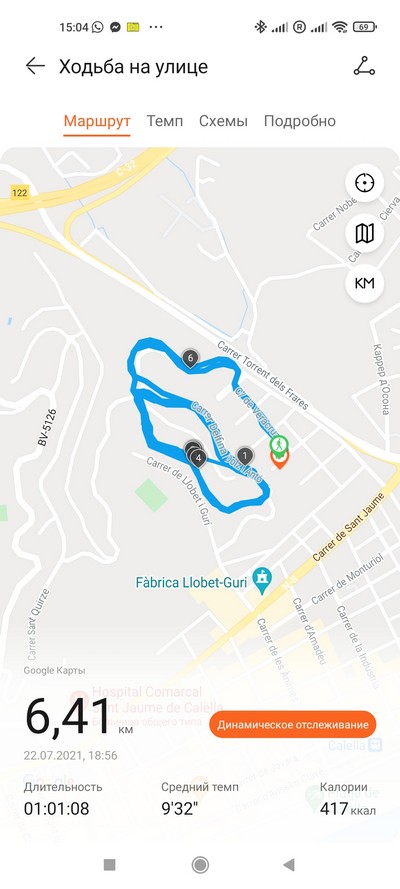 Еще один свайп влево - трек тренировки на карте. (У GT 2 также можно сделать третий свайп, чтобы получить график восхода-захода солнца, но здесь такого нет.)