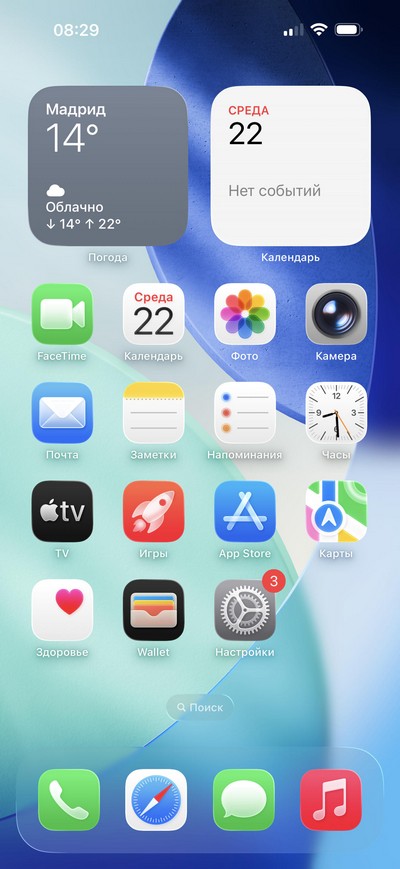 iOS 26, главный десктоп и установленные в системе приложения.