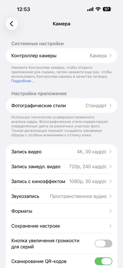 Настройки камеры и контроллера камеры.