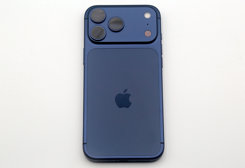 Задняя крышка - анодированный алюминиевый сплав. В этом поколении Apple радикально поменяла дизайн задней части: блок камер теперь растянут на всю ширину задней крышки, а под блоком камер на задней крышке находится большая керамическая вставка, выполняющая декоративные функции.