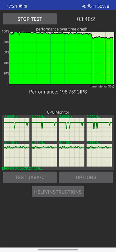 Тест на троттлинг. Первые три минуты потери производительности не было вообще, после трех минут серьезной нагрузки производительность опустилась всего на 10%.
