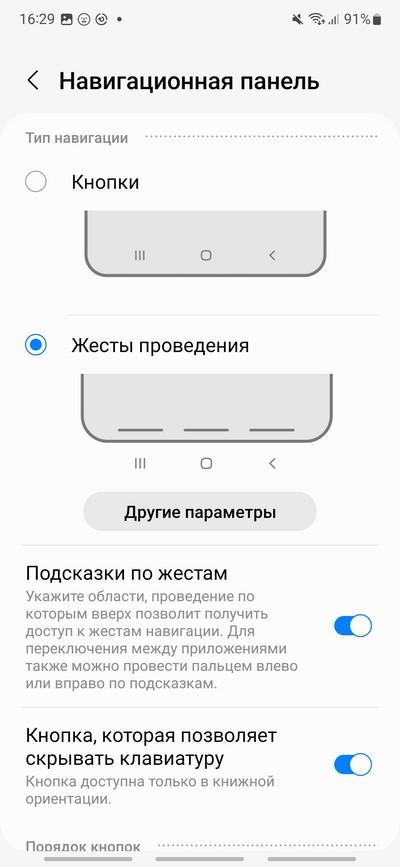 Как обычно, управлять смартфоном можно с помощью кнопок навигации (они настраиваются) или с помощью жестов. Также, как обычно у смартфонов Samsung, кроме стандартных жестов здесь можно включать жесты только от нижнего краях экрана, что лично мне нравится больше всего.