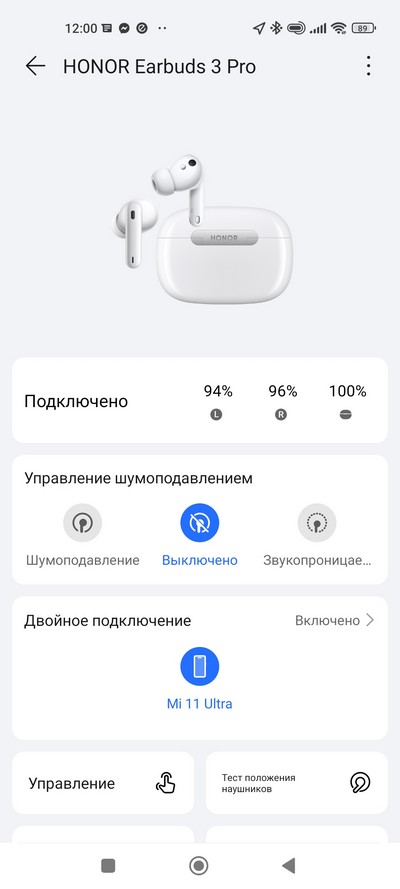 Главная страница устройства. Тут все очень наглядно и понятно. Уровни зарядки наушников и кейса, режим шумоподавления, режим подключения к двум устройствам, управление, настройки, тест положения наушников, обновление, руководство пользователя.