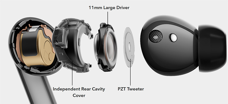 Конструктивно каждый наушник представляет собой 11-миллиметровый драйвер с независимой задней крышкой и дополнительным пьезоэлектрическим твитером.