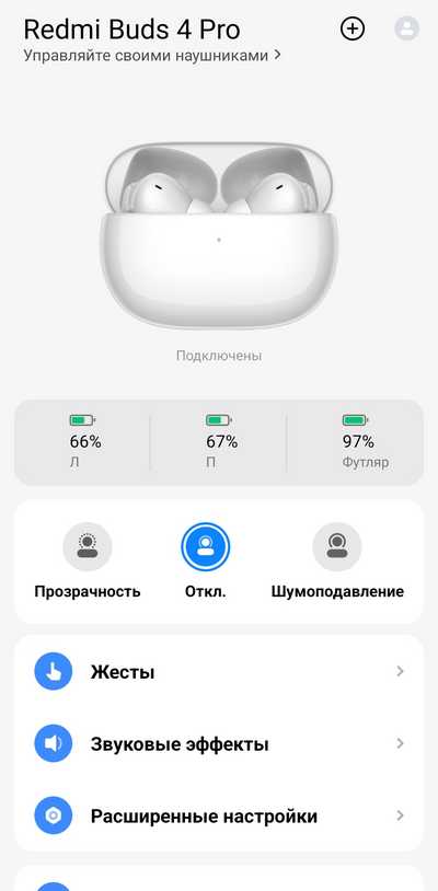 Главная страница приложения: уровни заряда наушников и кейса, режимы шумодава, настройки, звуковые эффекты, расширенные настройки и обновление прошивки.