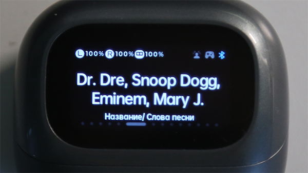 Однако на дисплей могут выводиться далеко не только обои. По умолчанию на него выводится всякая справочная информация - уровни заряда наушников и кейса, режимы работы наушников, - а также название проигрываемой композиции.