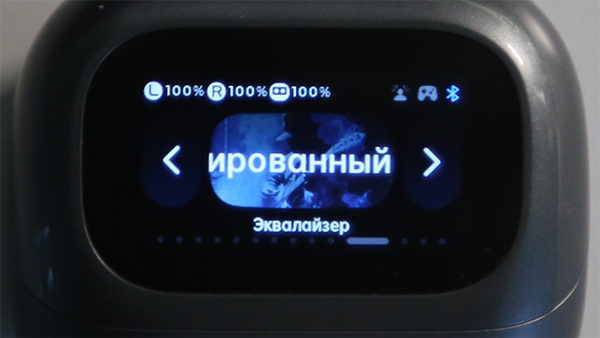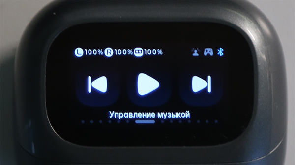 Экран - сенсорный, его можно прокручивать, и там будут последовательно выводиться самые разные виджеты: управление плеером, уровень громкости, эквалайзер, включение/выключение различных специальных режимов (игровой, пространственный, шумодав), настройка языка, таймаут экрана, яркость экрана, настройка обоев, поиск наушников, удаленное переворачивание страниц на смартфоне, удаленное управление камерой (съемка).